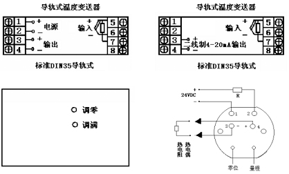 對導(dǎo)軌式溫度變送器輸入可以是熱電偶、熱電阻、標(biāo)準(zhǔn)信號。工作電源接端子1、2,4~20mA輸出信號接3正、4負(fù);對二線制4~20mA輸入信號正接5、負(fù)接6;熱電阻單端A5、并聯(lián)端B、C分別接6、7。