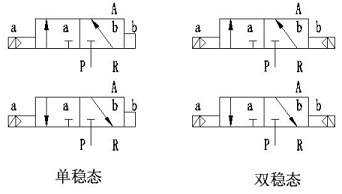 閥體兩端各有一個(gè)控制腔,兩個(gè)控制腔各有一個(gè)Φ2mm的先導(dǎo)孔與氣源壓力口(接口“P” )相通,氣源氣由先導(dǎo)閥來控制進(jìn)入控制腔(接口“A” )。當(dāng)一端線圈通電,磁力作用打開先導(dǎo)閥,氣源氣進(jìn)入該端控制腔(接口“A” ),推動(dòng)活塞帶動(dòng)閥芯,改變工作狀態(tài)。閥體有單穩(wěn)態(tài)和雙穩(wěn)態(tài)兩種,單穩(wěn)態(tài)閥線圈只有長(zhǎng)期通電,電磁閥才能保持狀態(tài),一旦掉電,馬上復(fù)位。雙穩(wěn)態(tài)閥一旦線圈通電,閥位狀態(tài)改變后,即使掉電,仍保持現(xiàn)狀不變,只有當(dāng)一端線圈通電時(shí),閥位才會(huì)發(fā)生變化。