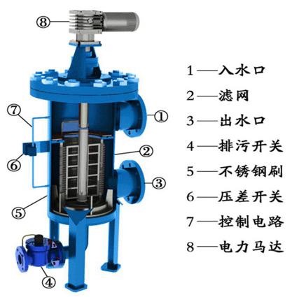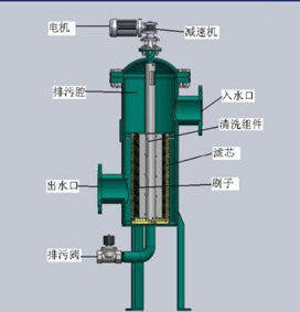 的排污閥;馬達帶動本體濾網(wǎng)內(nèi)的兩把不銹鋼刷轉(zhuǎn)動,被濾網(wǎng)所