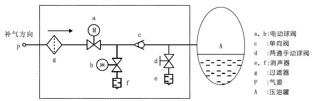 自動(dòng)補(bǔ)氣:當(dāng)自動(dòng)補(bǔ)氣條件滿足時(shí),關(guān)閉電動(dòng)球閥b,打開電動(dòng)球閥a,補(bǔ)氣過(guò)程:高壓氣氣源P→過(guò)濾器g→單向閥c→壓油灌A補(bǔ)氣。